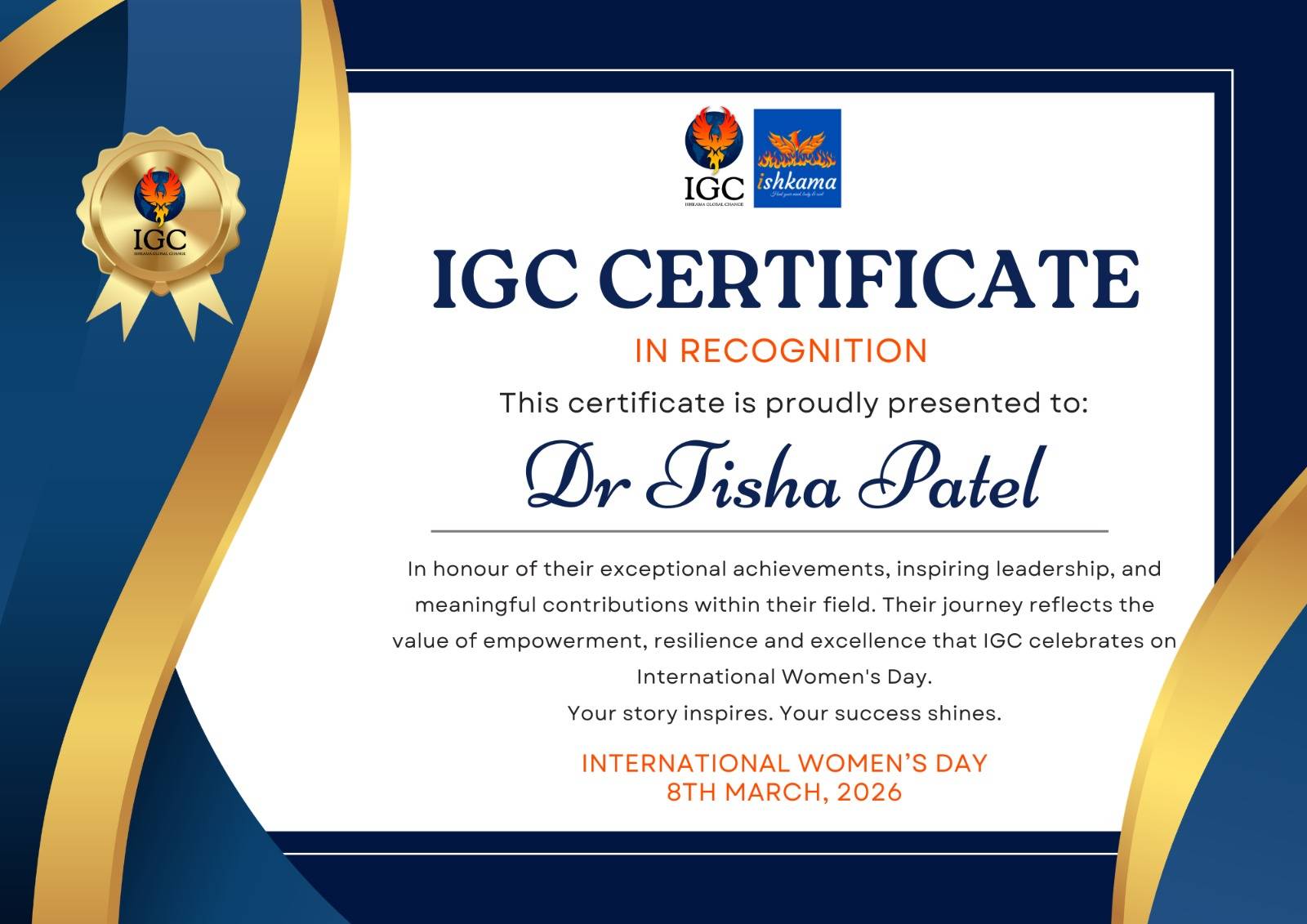 Today, I had the privilege of receiving an award and recognition from Ishkama Global Change. The certificate was presented to women across different fields in honour of exceptional achievements, inspiring leadership, and meaningful contributions within their professions.